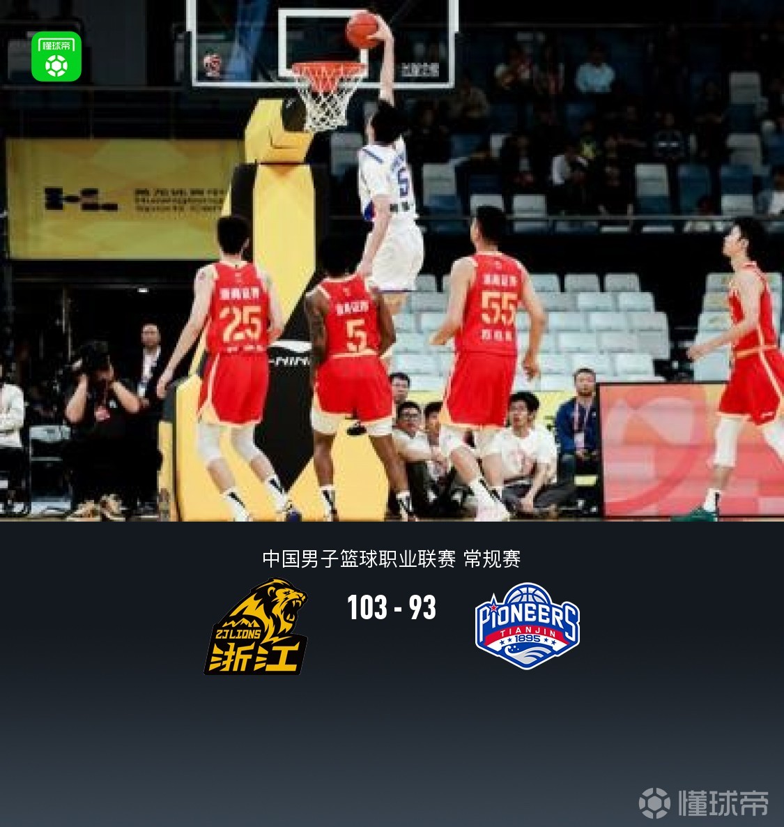 北京时间4月24日中国男子篮球职业联赛 常规赛,浙江浙商证券对阵天津先行者。半场广厦55-45天津,最终广厦103-93天津。