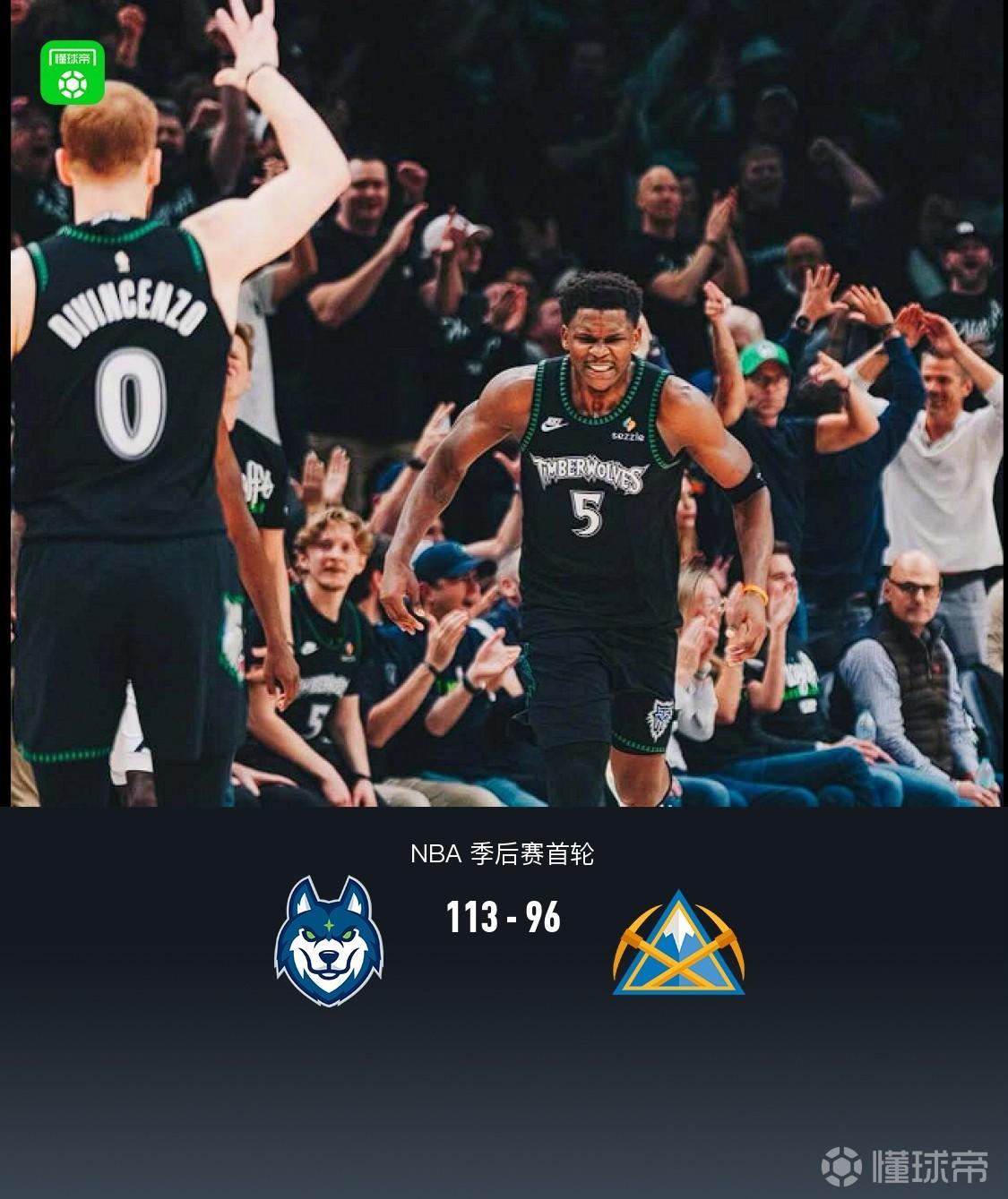 北京时间4月24日NBA 季后赛首轮,明尼苏达森林狼对阵丹佛掘金。首节森林狼完全压制掘金取得25-11领先,半场森林狼61-39掘金,下半场森林狼始终保持20分上下领先,最终森林狼113-96掘金,大比分2-1领先。