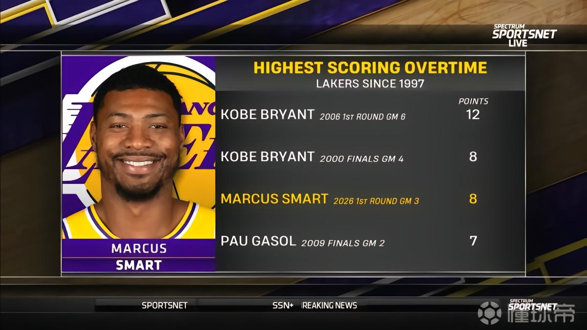 赛后根据统计,斯马特此战加时赛拿下8分也让他成为了湖人队自1997年以来,季后赛单场加时赛得分第二高的球员,仅次于2006年季后赛首轮G6加时赛砍下12分的科比。