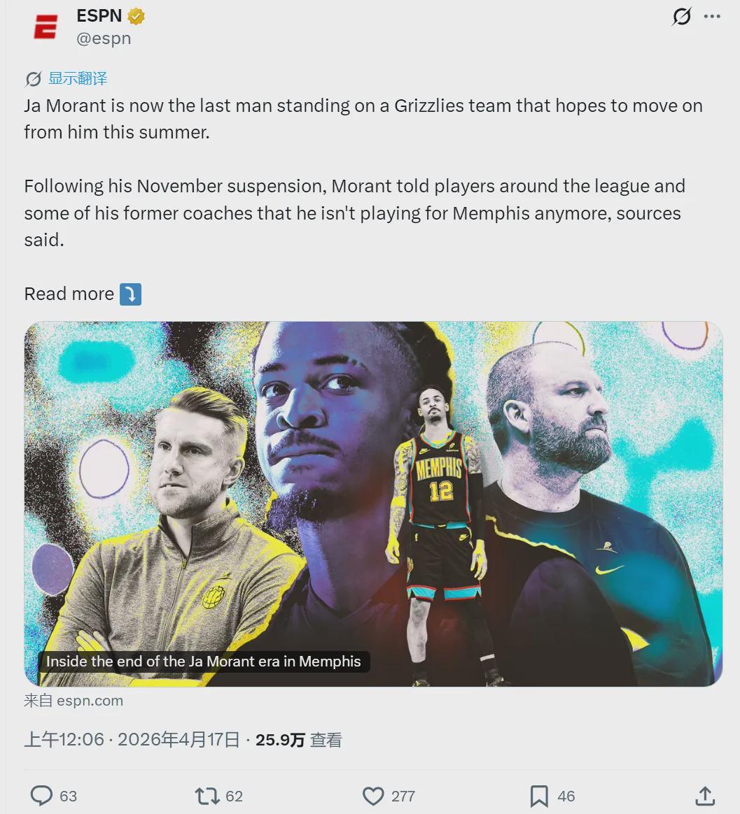 不打了!灰熊生涯结束!最快速度交易莫兰特