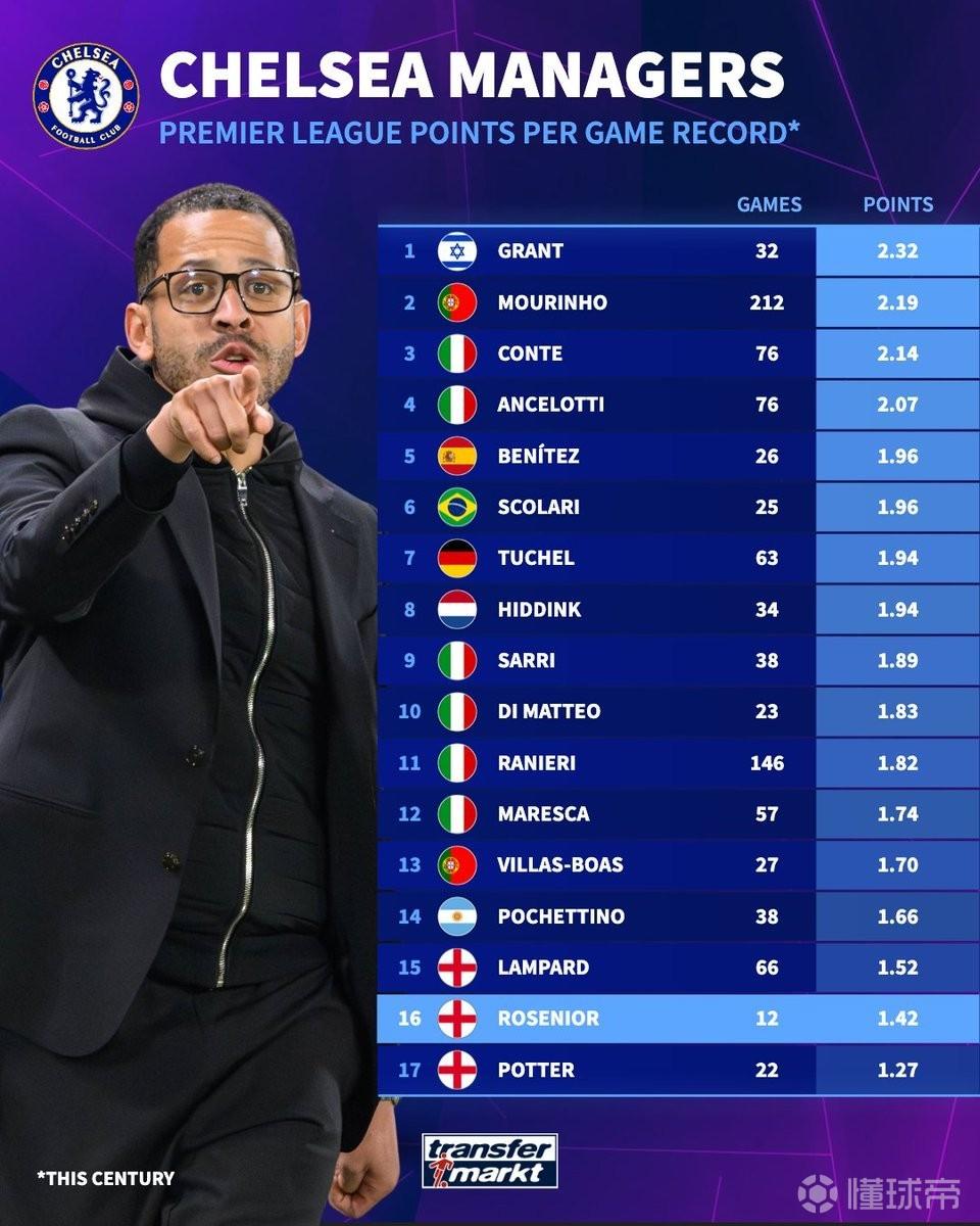 据德国转会市场网站统计,罗塞尼尔执教切尔西至今英超场均积分为1.42分,为本世纪切尔西主帅第二低。