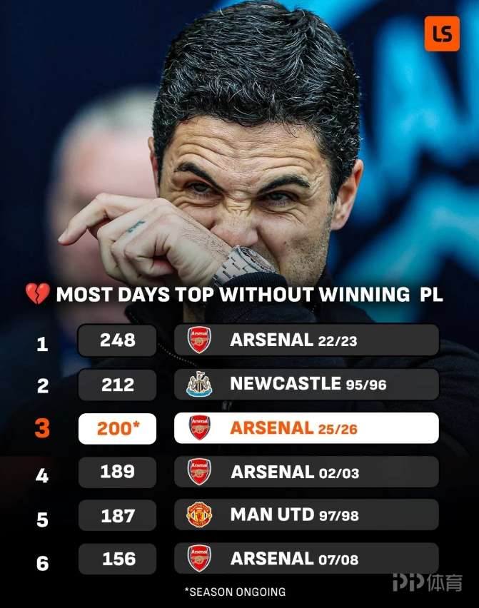 据LiveScore的数据显示,如果本赛季最终未能夺冠,他们将可能成为英超历史上“领跑天数最多却未能夺冠”的第三悲情球队 。