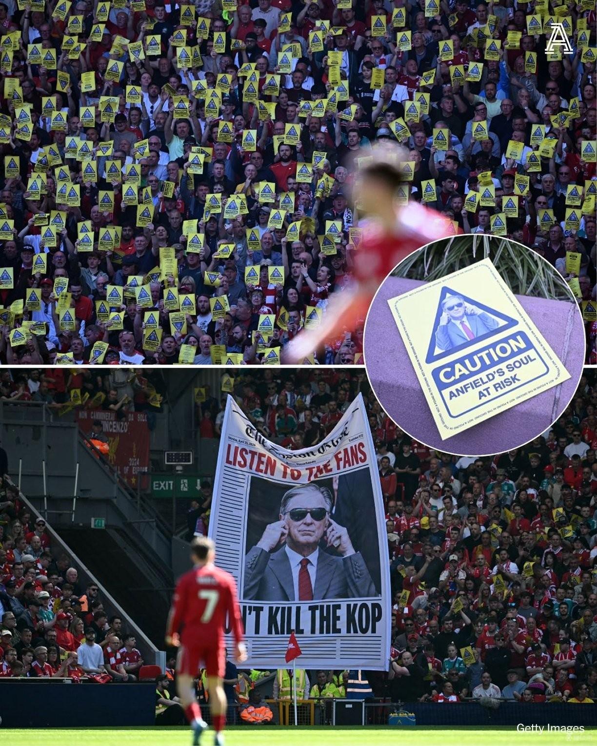 这些黄牌上面印有俱乐部大股东约翰-亨利的照片以及“警告:安菲尔德的灵魂正面临威胁”字样。