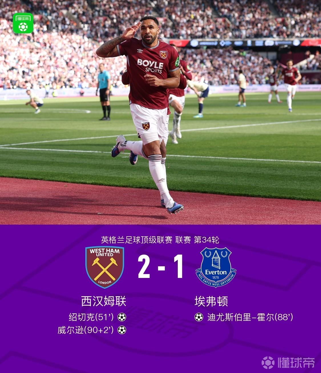 北京时间4月25日22:00,英超第34轮,西汉姆联保级关键战主场对阵埃弗顿。上半场,蒂尔诺-巴里远射被门将没收。下半场,绍切克头球破门,蒂尔诺-巴里头球造险,霍尔抽射扳平,威尔逊替补登场补时完成绝杀,最终,西汉姆联2-1埃弗顿,仍高出降级区2分。