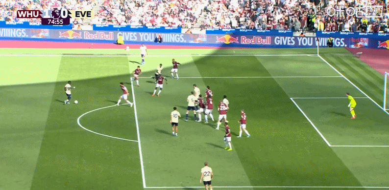 第88分钟,霍尔抽射破门!埃弗顿1-1扳平,西汉姆联实时排名跌入降级区